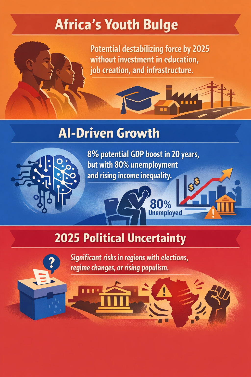 AI-driven job displacement could deepen inequality more than current paradigms predict. Without effective education, job creation, and social safety nets, the youth bulge in regions like Africa may become a destabilizing force, pushing migration flows and geopolitical recalibration (The Elephant, 2025).